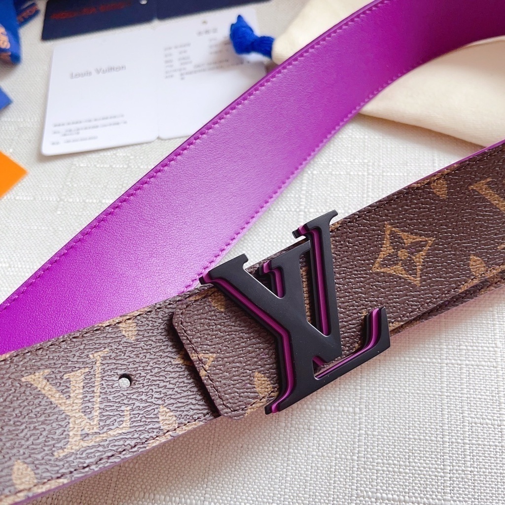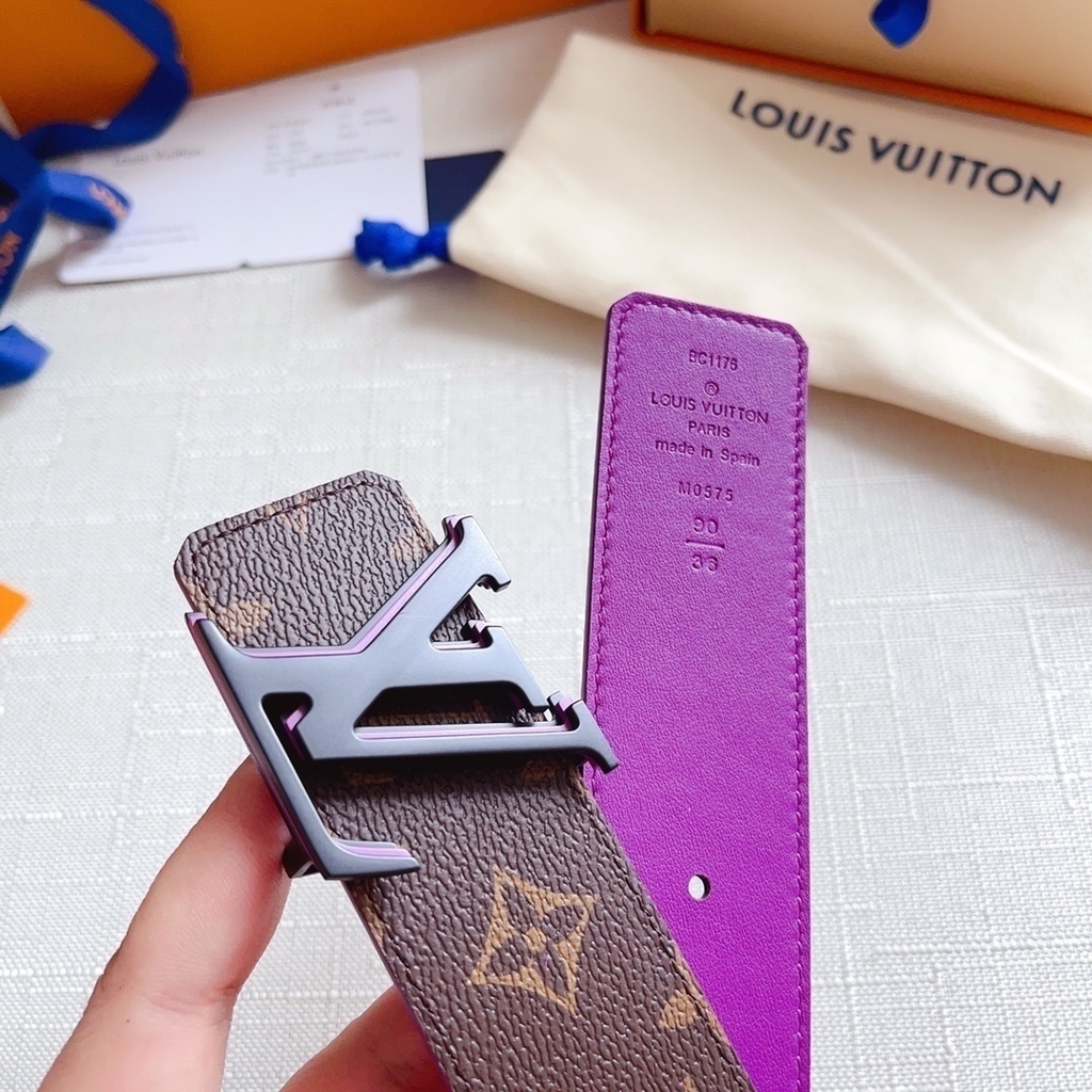 Este cinto reversível oferece versatilidade incomparável: de um lado, a clássica lona Monogram para um visual elegante e atemporal; do outro, couro de vitelo em tom roxo intenso para quem busca uma declaração de estilo arrojada.