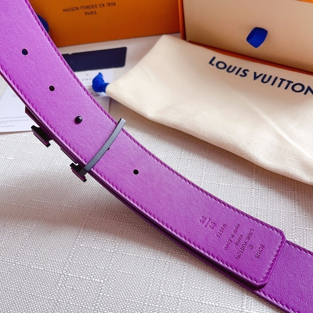 O cinto Louis Vuitton Vavin Reversível Shaped é uma peça statement que combina tradição e inovação. Sua fivela LV Shaped destaca-se pela construção em camadas e o contraste marcante entre preto fosco e roxo vibrante, reinterpretando as iniciais da Maison com modernidade.