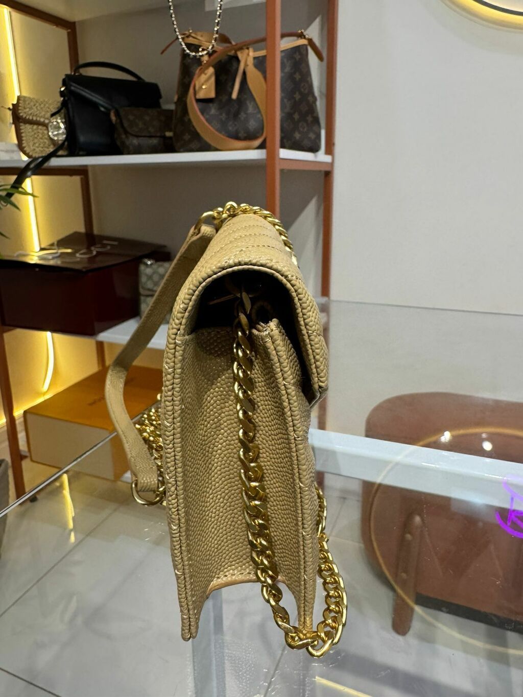 Monograma Icônico: O lendário monograma YSL em metal dourado se destaca no fecho, adicionando um charme inegável e reconhecível à peça.